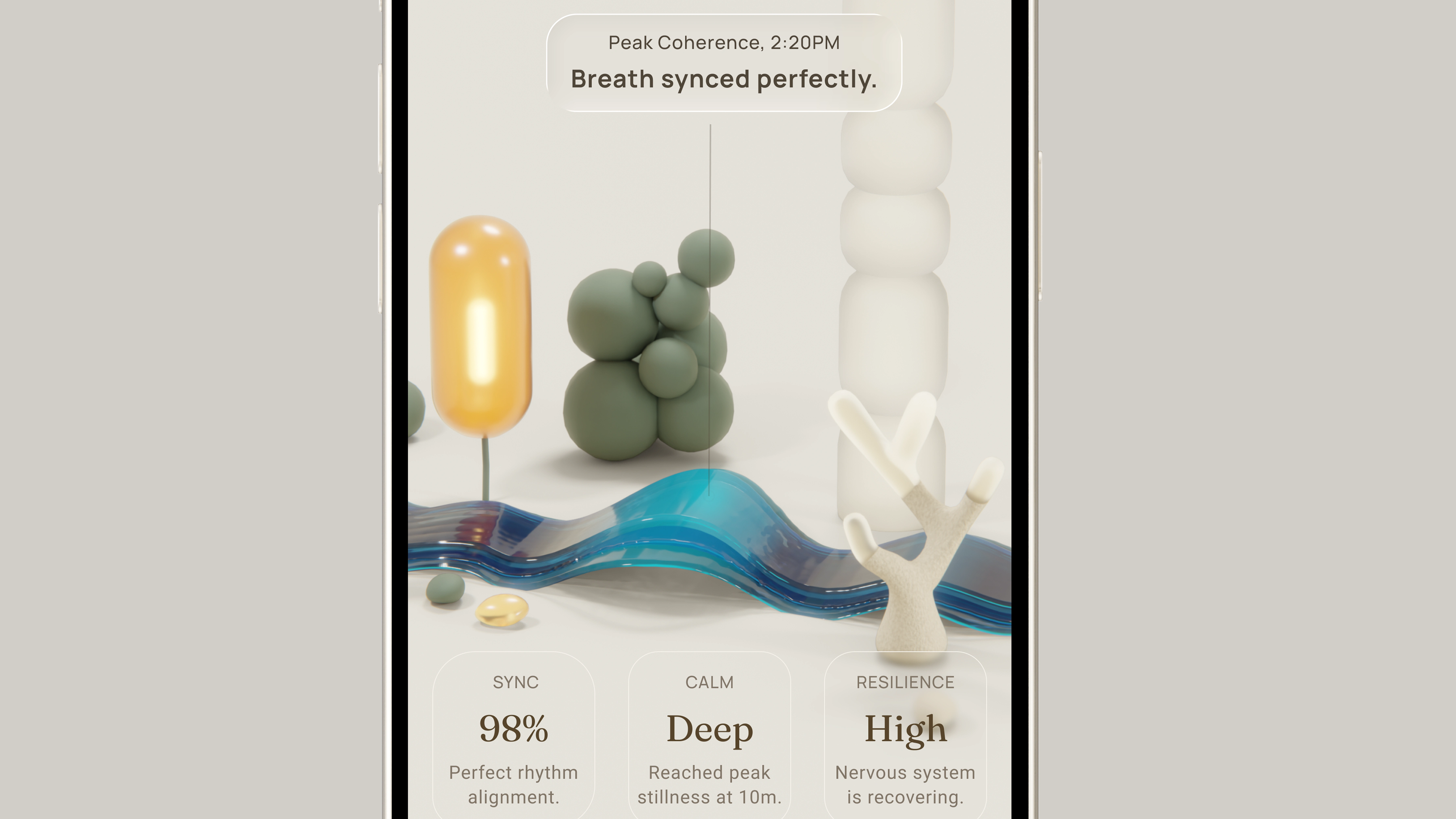 This screen turns raw biometric data, like heart rate variability and breath duration, into a visual landscape:
