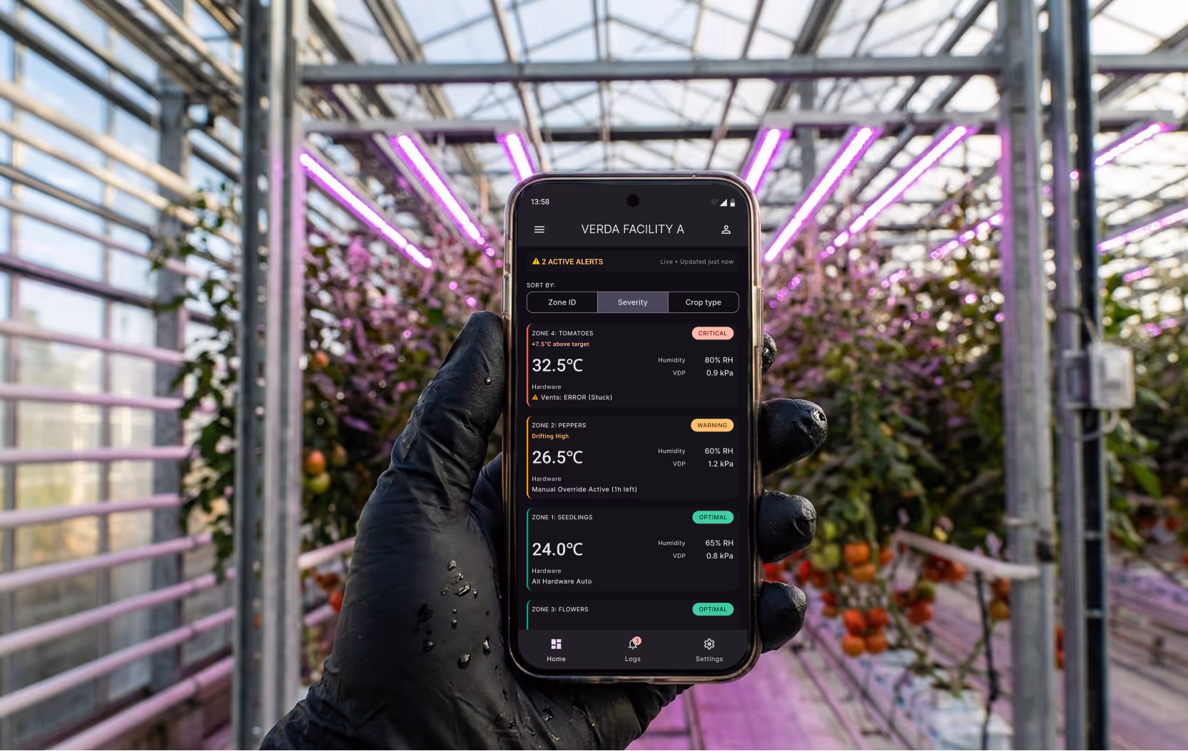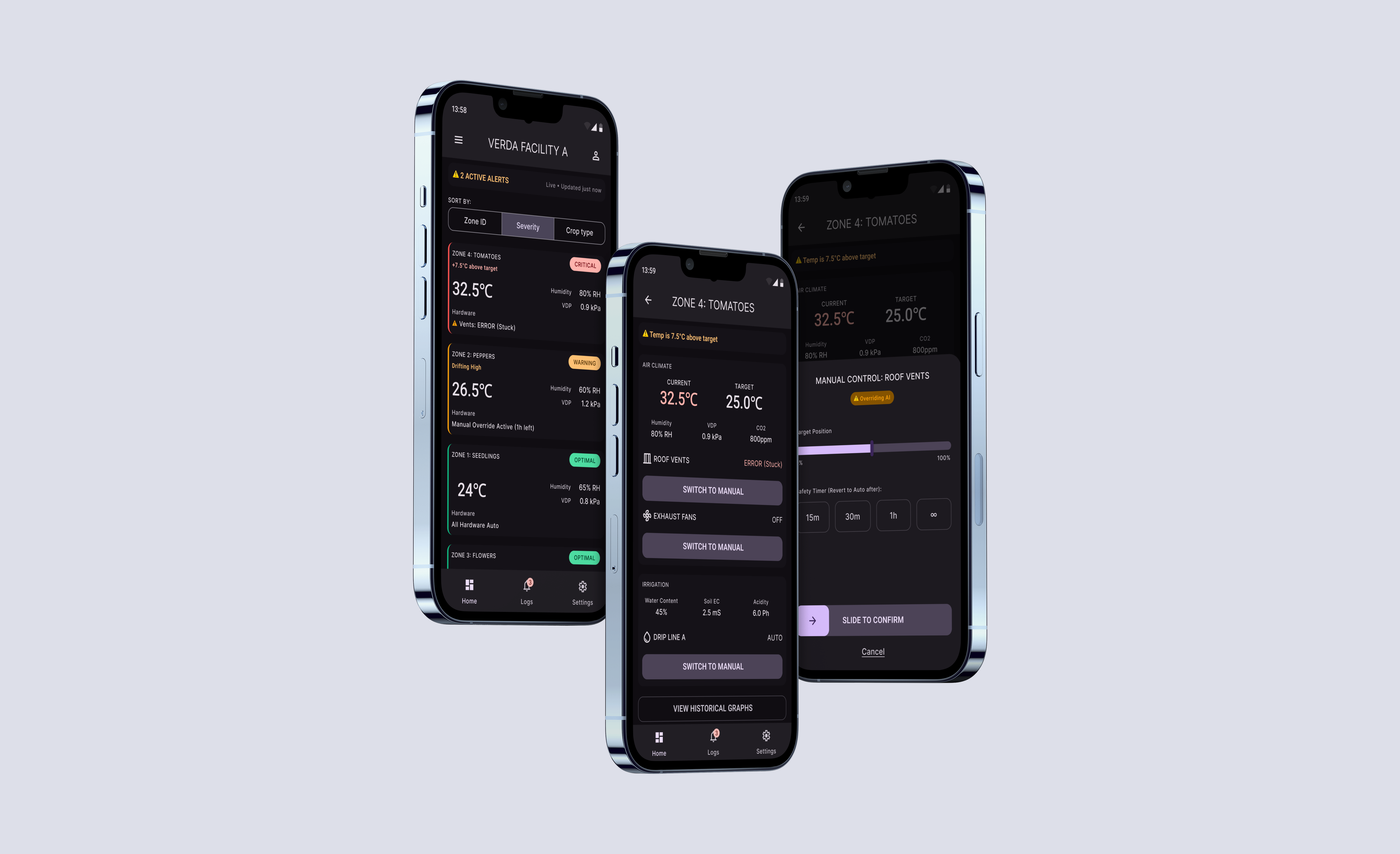 - The Dual-Layer Color Logic: To eliminate "color soup," we established a strict semantic rule. Red, amber, and green are reserved exclusively for Biological Status (The Plant). Deep Purple is reserved for System Interaction (The Human). This ensures that when a grower sees red, they know it's a plant emergency, not a UI state.