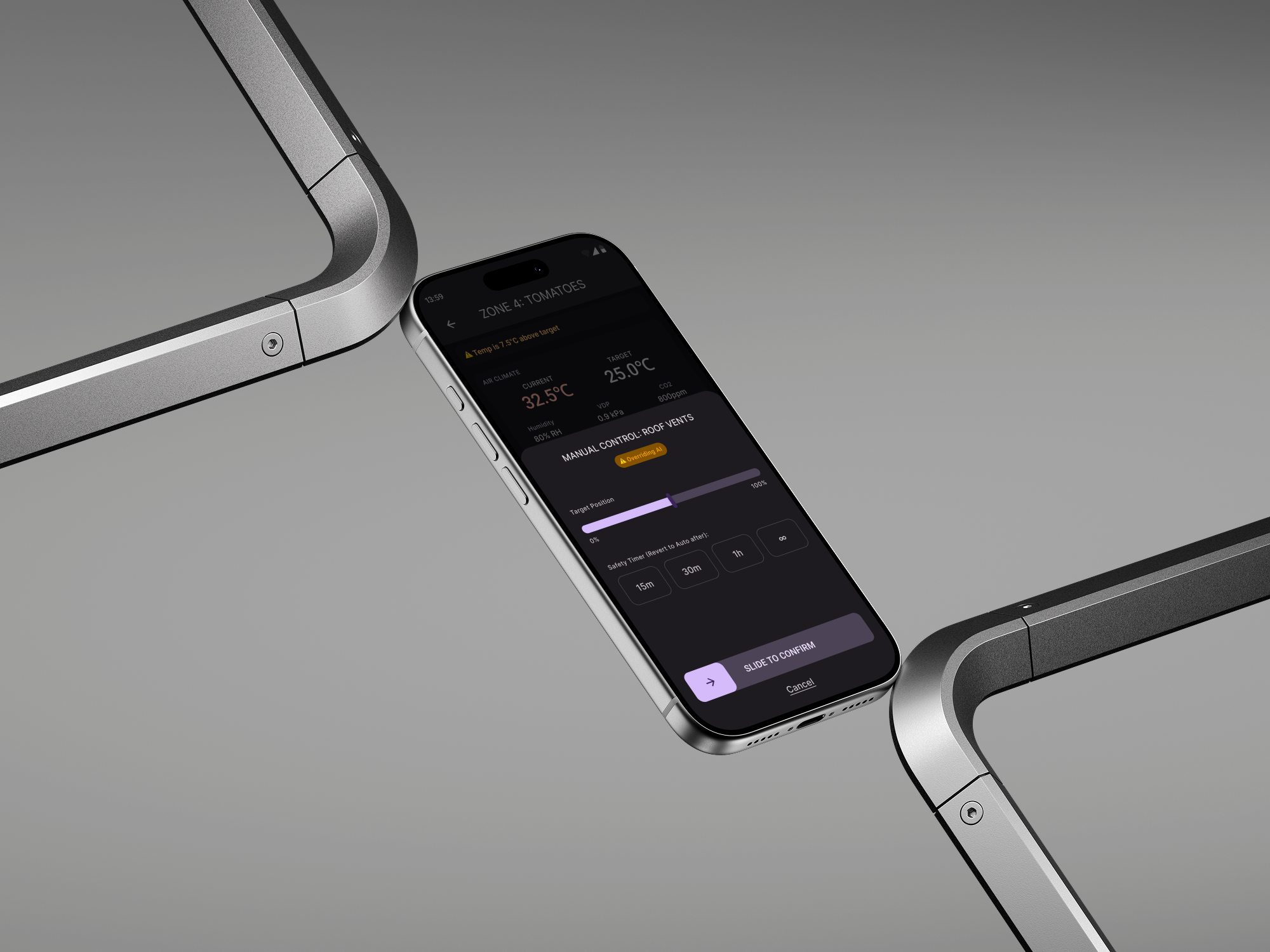 The interface treats the smartphone not as a delicate media device, but as a ruggedized industrial control panel. Every visual choice was dictated by the physics of the greenhouse: